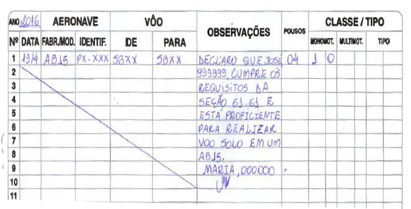“Declaro que revisei o planejamento de navegação de (Nome do piloto endossado, CANAC do piloto endossado) e o considero apto a realizar voo solo entre (designativos dos aeródromos de partida, destino, bem como sobrevoos e pousos intermediários se houver) em um (modelo da aeronave) no dia (data). (Nome, CANAC e assinatura do instrutor)”