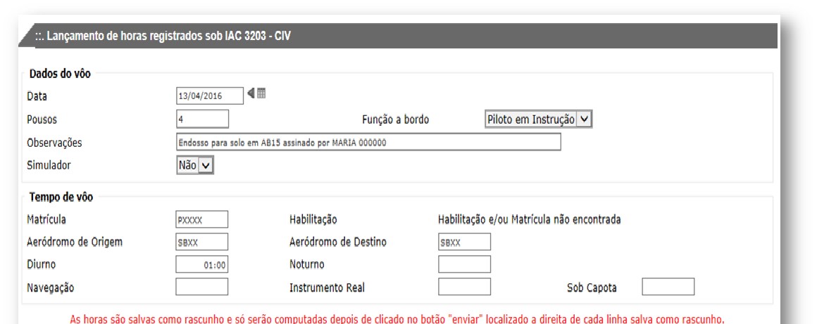 - Para os lançamentos em sua própria CIV Digital, o piloto endossado deve utilizar o campo “Observações”, conforme o exemplo abaixo:
